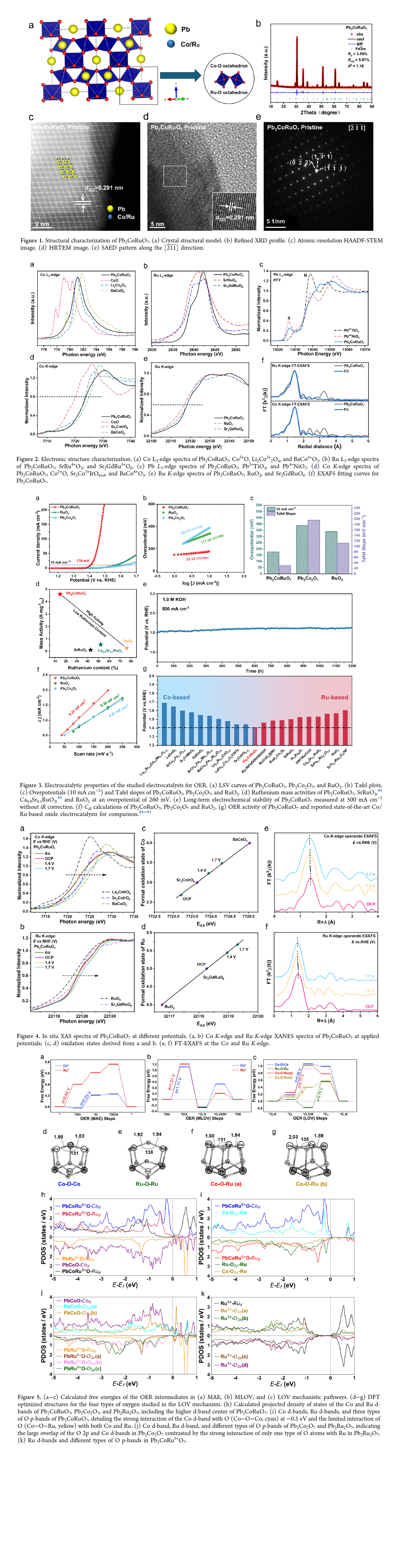 Green hydrogen from water requires the development of efficient and low-cost catalysts for anodic oxygen evolution reaction (OER), which is the main obstacle for electrochemical water splitting. Herein, we focus on an OER catalyst (Pb2CoRuO7) featuring Ru6+, which exhibits an ultralow overpotential of 176 mV at 10 mA cm?2 and a Tafel slope of 30.52 mV dec?1 vs 340 mV at 10 mA cm?2 and a Tafel slope of 111.54 mV dec?1 for RuO2 in 1.0 M KOH solution. In situ X-ray absorption experiments demonstrated the gradual conversion of Ru5+ ions into high-valence Ru6+, while a portion of Co3+ ions transformed into Co4+ during the OER process. Density functional theory calculations revealed that the ultrahigh OER activity of Pb2CoRuO7 was contributed by both metal-site adsorbate evolution (MAE) at the Co site and the latticeoxygen-vacancy-site (LOV) mechanism involving lattice oxygen located between Ru6+ and Co. Our work presents a new and unusual OER catalyst where both the MAE and LOV mechanisms cooperatively facilitate catalytic activity.